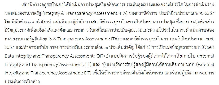ขอเชิญผู้มารับบริการหรือมาติดต่อราชการร่วมประเมินคุณธรรมและความโปร่งใสในการดำเนินงานของหน่วยงานภาครัฐ (Integrity and Transparency Assessment : ITA) ประจำปีงบประมาณ พ.ศ. 2567 ของสถานีตำรวจภูธรบ้านคา ประจำปีงบประมาณ พ.ศ. 2567